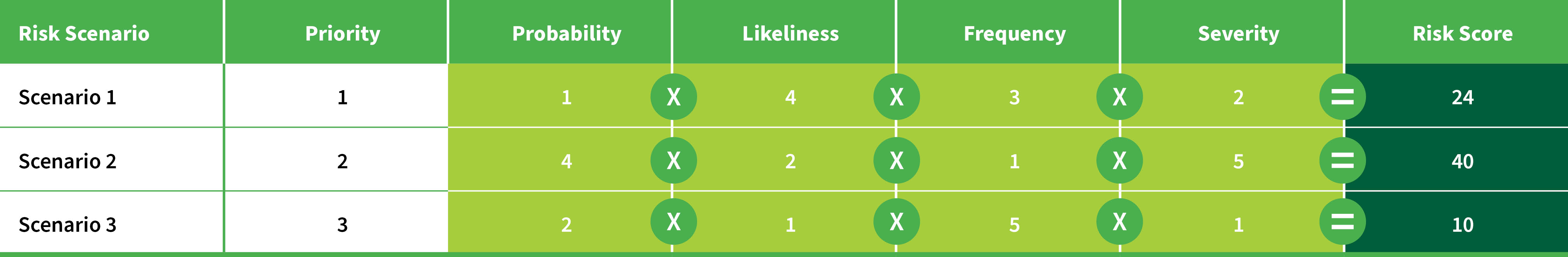 - The second element – PROBABILITY. This is measured on a scale. In our exercise, we assigned probability to a scale of 1–5 (least to most probable).